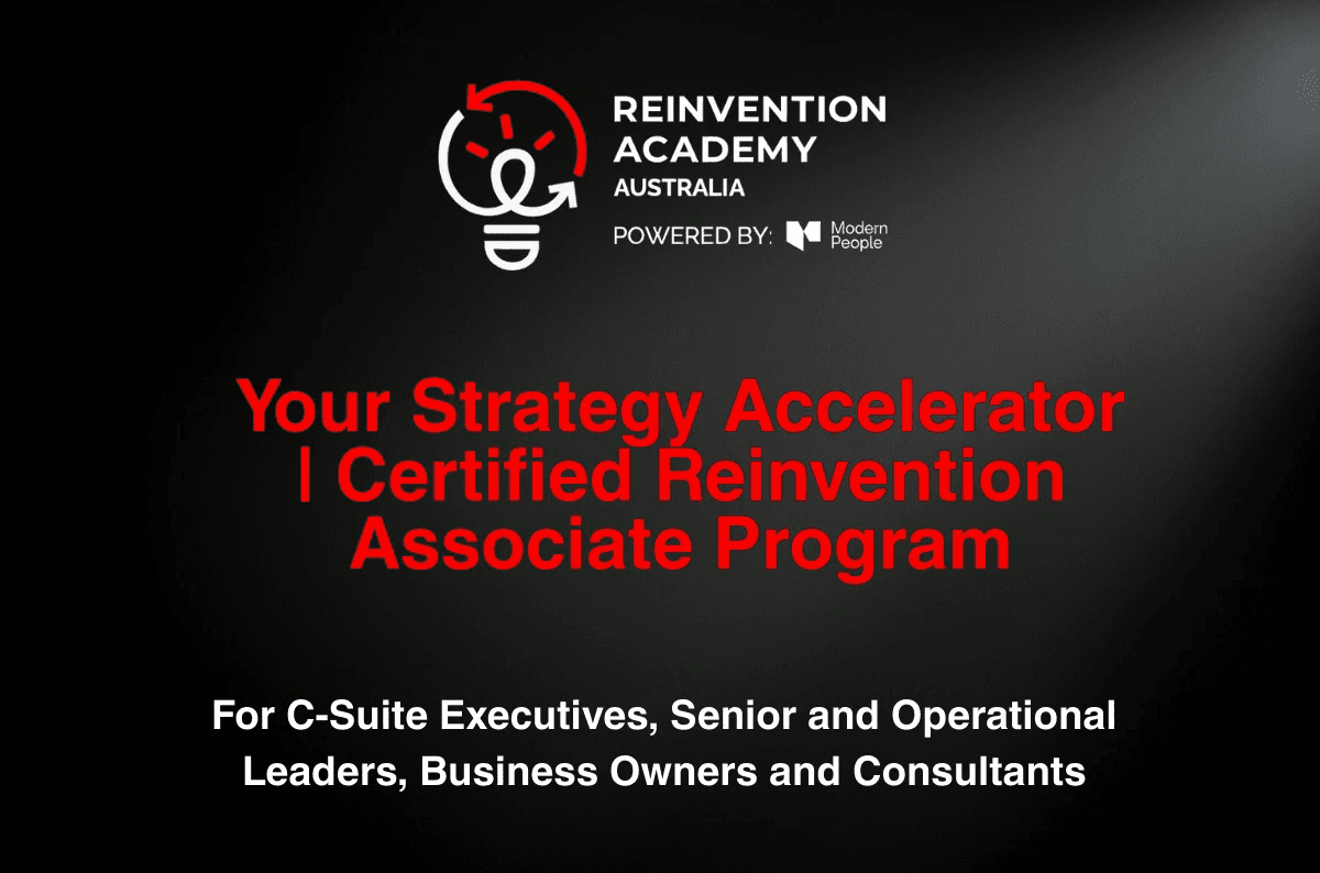 The Certified Reinvention Associate is a four week, cohort based certification delivered live by Global Reinvention Founder Dr Nadya and Reinvention Academy Australia Co-founders Jennifer and Taryn. It equips leaders and consultants with practical tools to embed reinvention as a repeatable approach across strategy, operations, and ways of working.